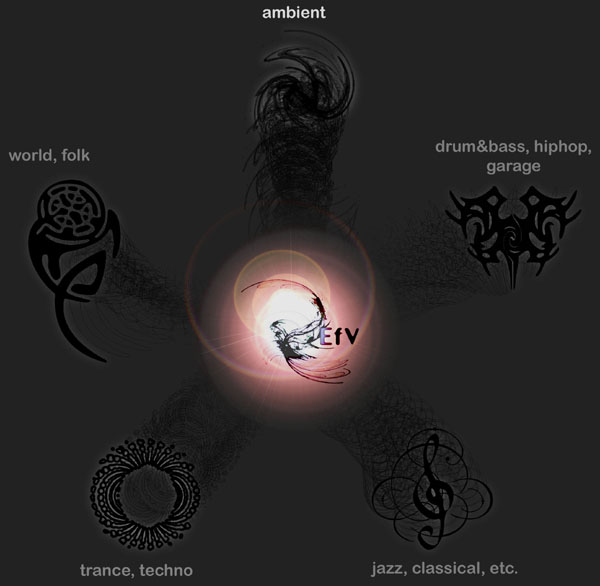 The "void" is what the live-created music of EfV begins from . . . EfV uses no pre-prepared musical structure at all . . . each performance starts from genuine emptyness, and evolves using the Fine-Art process . . . perception of the manifested creations determines subsequent creative decisions, resulting in genuine art that could not have been predicted before it unfolds in real-time. Every EfV event is unique and the emotions of the audience response are part of the creative process. Fundamental to EfV is the ambient concept . . . sound is more important than notes. Influences span the whole of dance music, as well as world and folk music, jazz, classical, and avant-garde, as well as the sounds of the enivoronment both natural and man-made. |